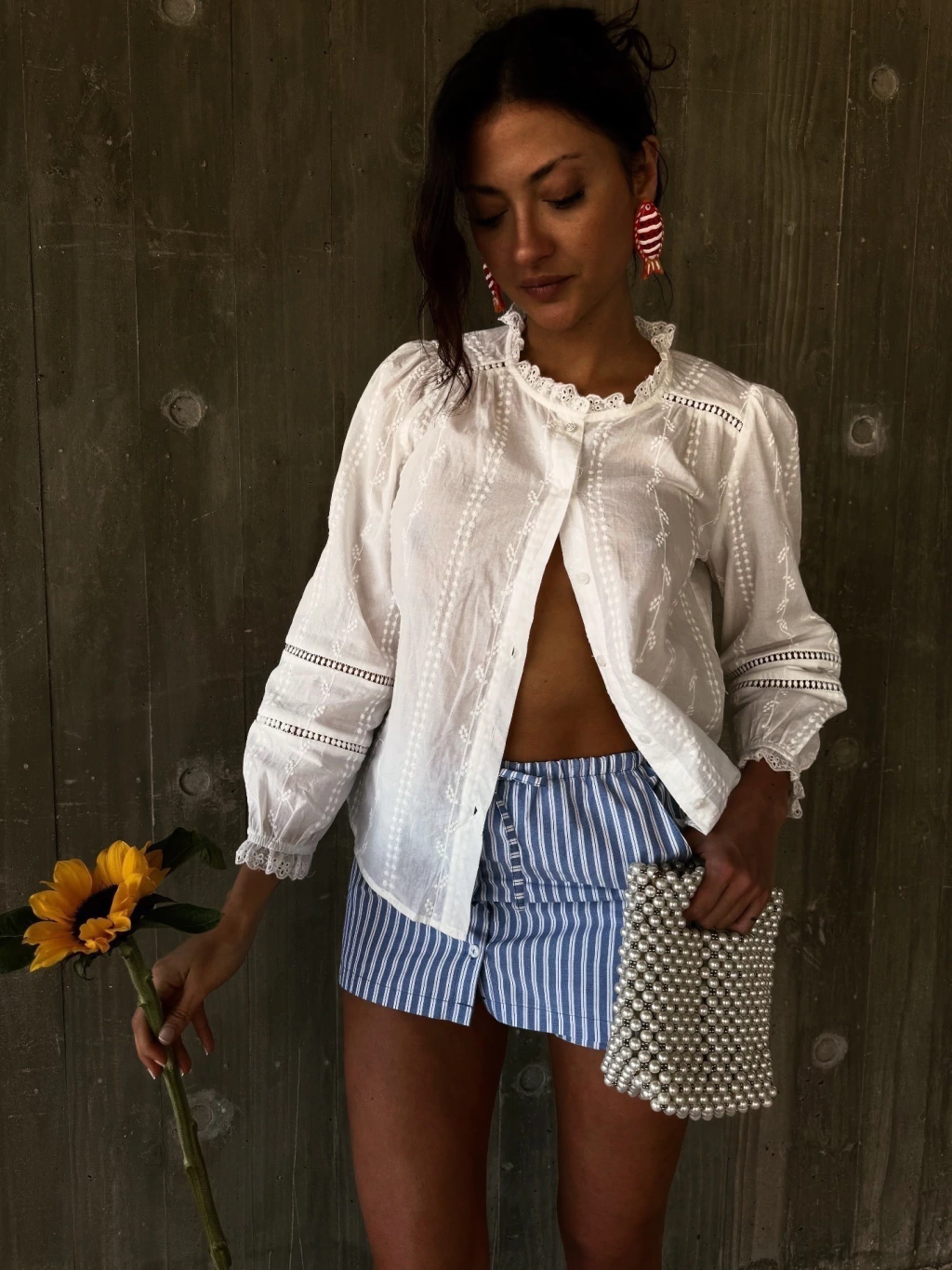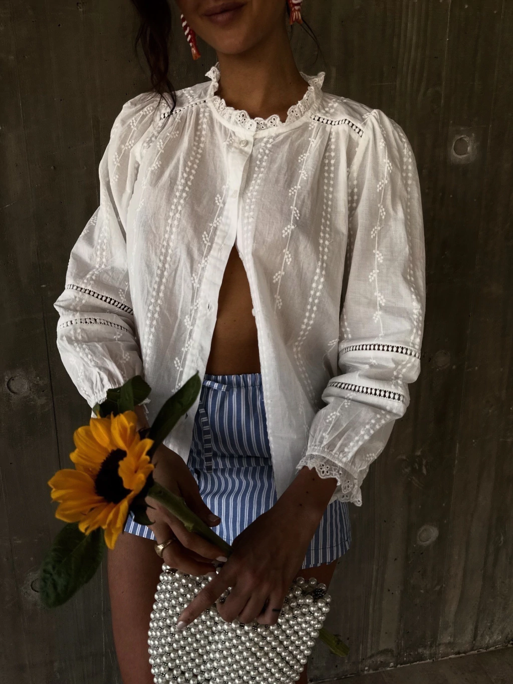 Descripción. Camisa cuello mao de algodón con bordado a tono, cierre frontal con botones y cierre de puño con elástico.