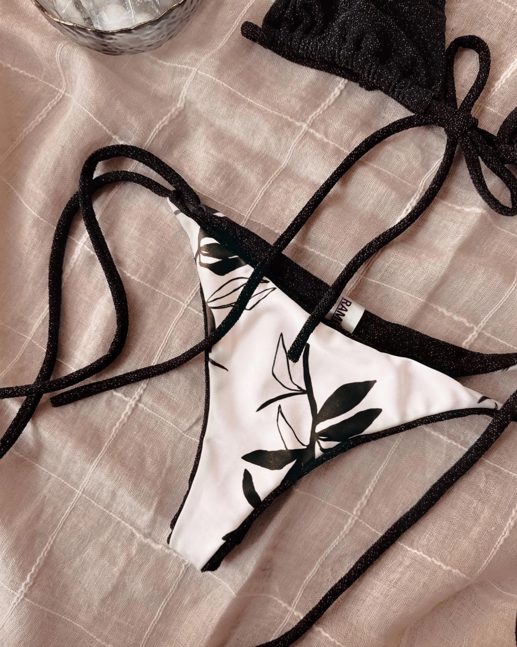 Descripción. Corpi triangulito, atada al frente con breteles regulables. Bombi colaless, reversible, atada en los costados, puede usarse de los dos lados.