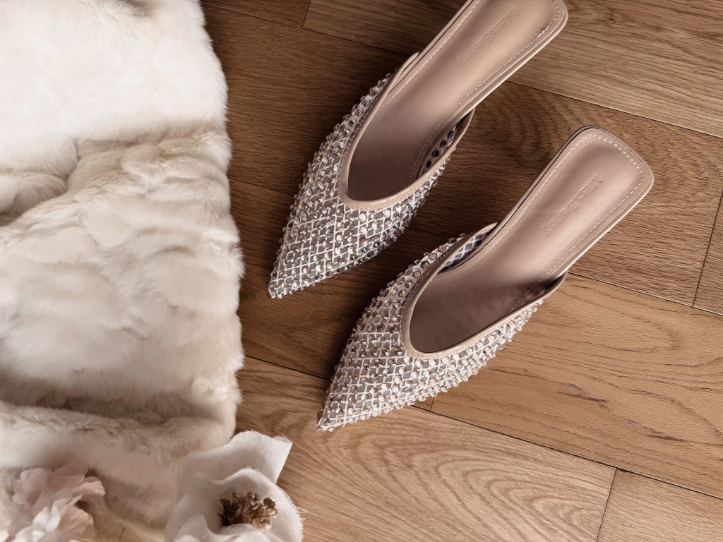 Descripción. Zapato mule con taco aguja bajo (kitten heel), cerrado en la punta y destalonado, con un diseño de material sintético negro con aplicaciones de tachas o cristales tipo strass en toda la superficie. Este tipo de zapato suele ser protagonista del outfit y se usa tanto con jeans como con vestidos o conjuntos sastreros para sumar un toque impactante y chic.