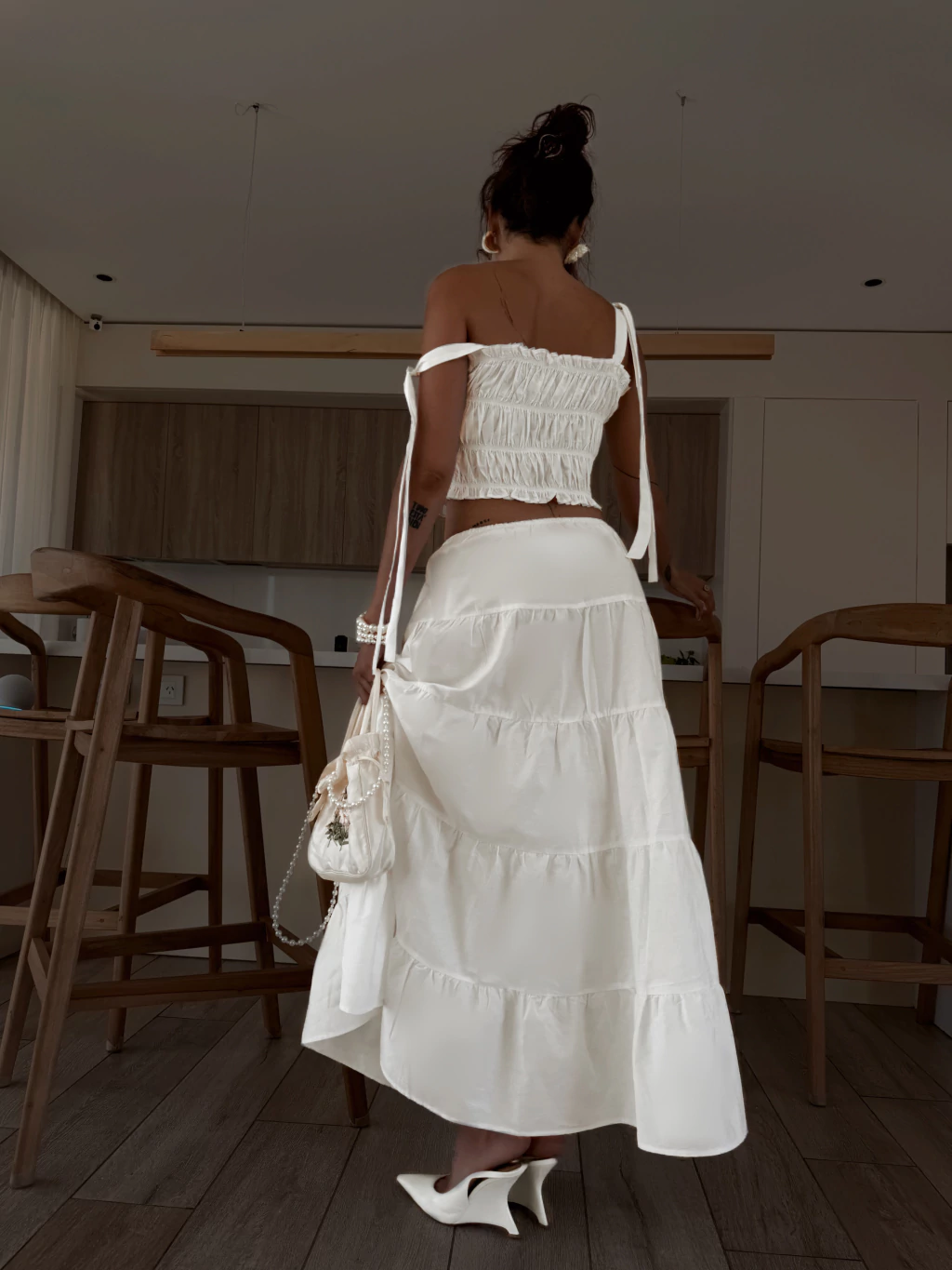Descripción. Top con escote recto, tiene una abertura en frente con moños y strass. Drapeado con frunces y costuras horizontales en toda la prenda y breteles largos.