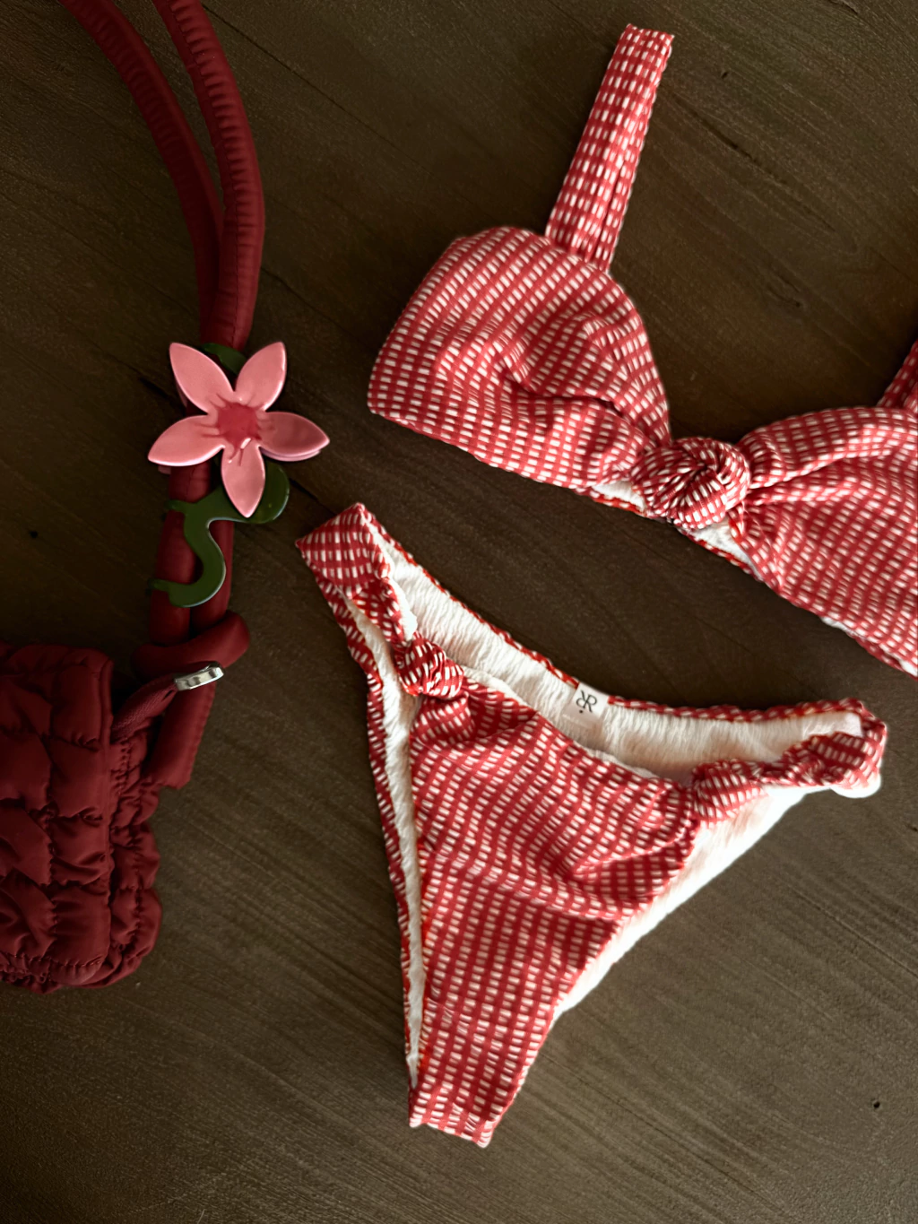 Descripción. Bikini 100% reversible, puede usarse de los dos lados, literalmente dos bikinis en uno. Corpi reversible prendido en la espalda, con nudo en el centro y breteles anchos. Bombi vedetina, con detalle de nudos en los costados, reversible.