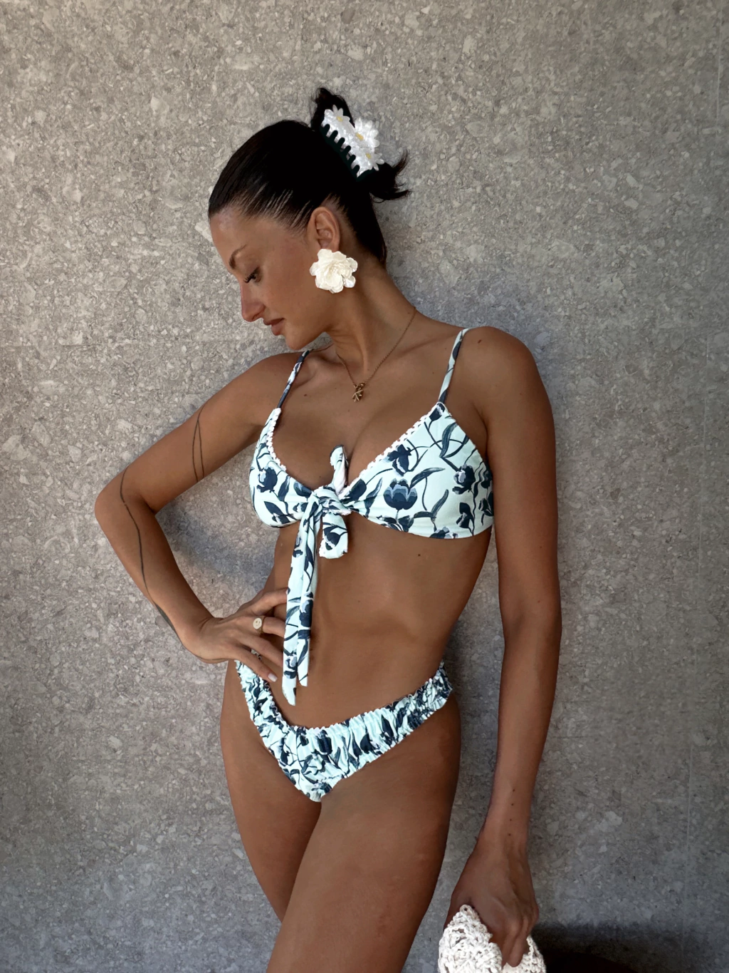 Descripción. Corpi triangulito, puede usarse de muchas maneras, con breteles regulables y detalle de puntilla. Bombi colaless, con contorno fruncido.
