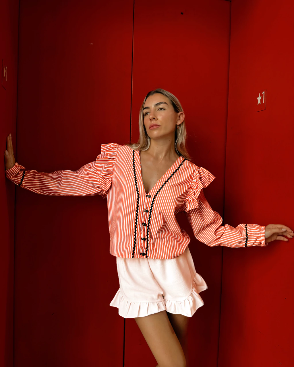 Descripción. Blusa con botones, escote en v, mangas acampanadas, volados en hombros y detalles en contraste.
